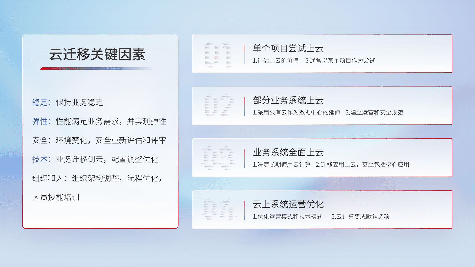 结合实际业务,,,从规划设计、、、云平台选型、、云原生改造、、、数据迁移、、集成交付,,迁移全过程为客户识别最佳上云路径,,,,做好风险识别管理,,,设计网络架构、、身份权限、、安全审计合规、、、操作审计、、、日志审计、、监控告警策略、、多站点容灾设计等,,对云上基础设施进行整体规划,,提升IT治理水平,,,,以满足弹性、、高可用、、高性能的需求。。。